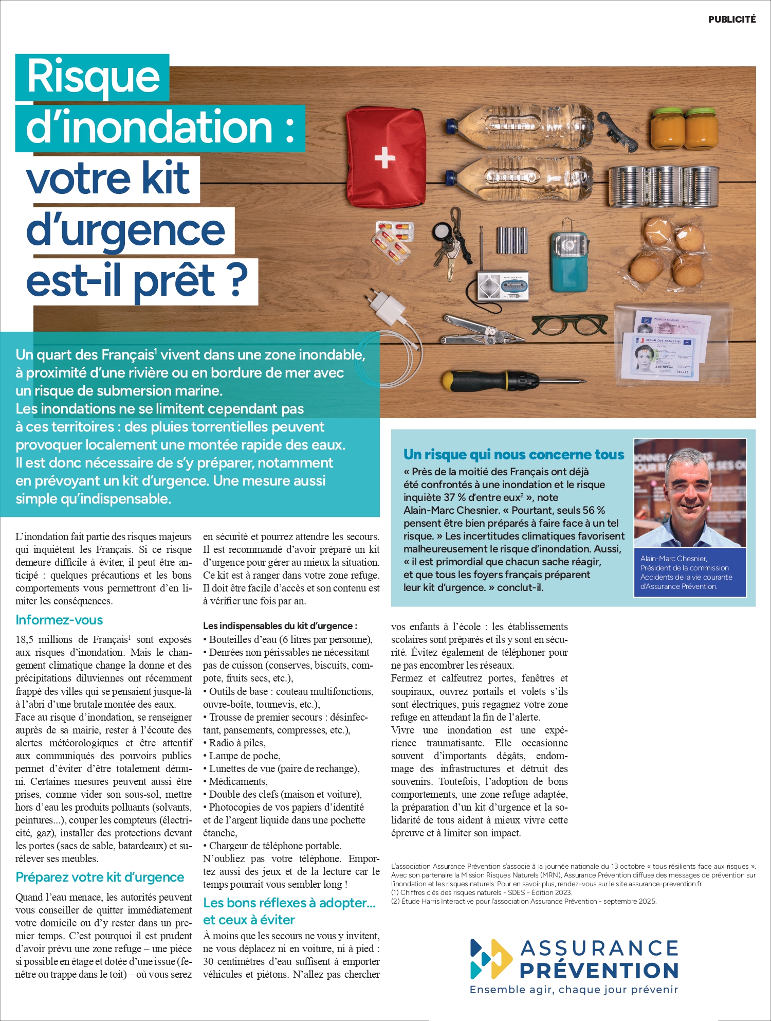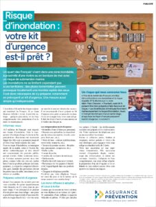 Pour accompagner la campagne, un visuel pédagogique du kit d’urgence a été réalisé. Bouteilles d’eau, trousse de secours, radio à piles, lampe torche, papiers d’identité protégés, chargeur portable, denrées non périssables…